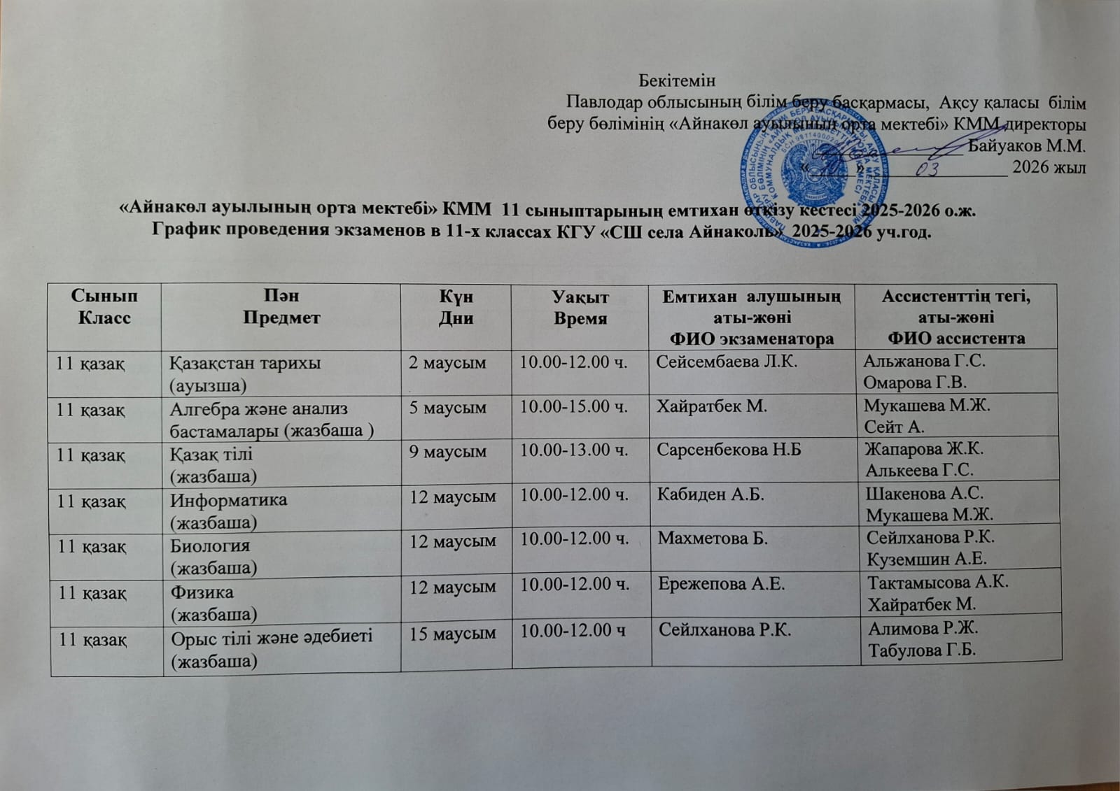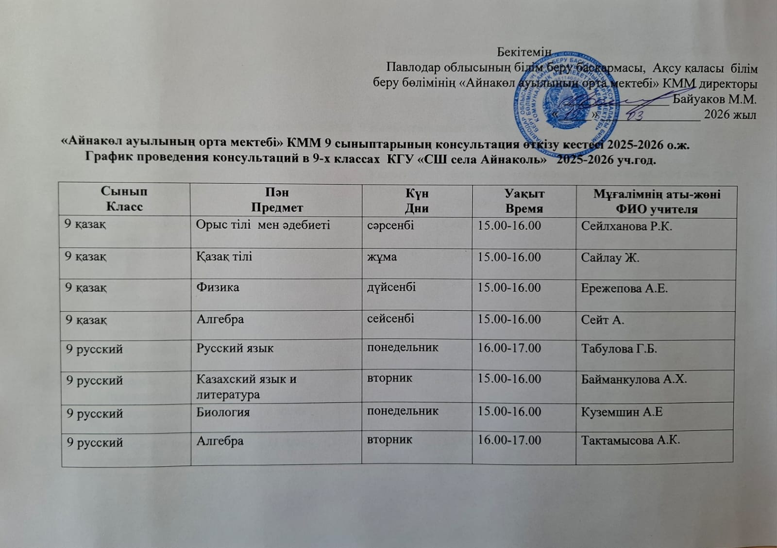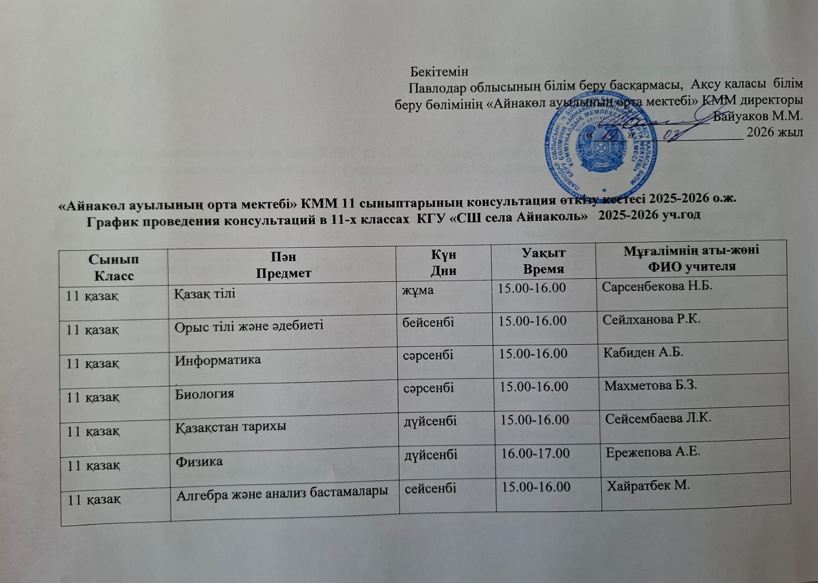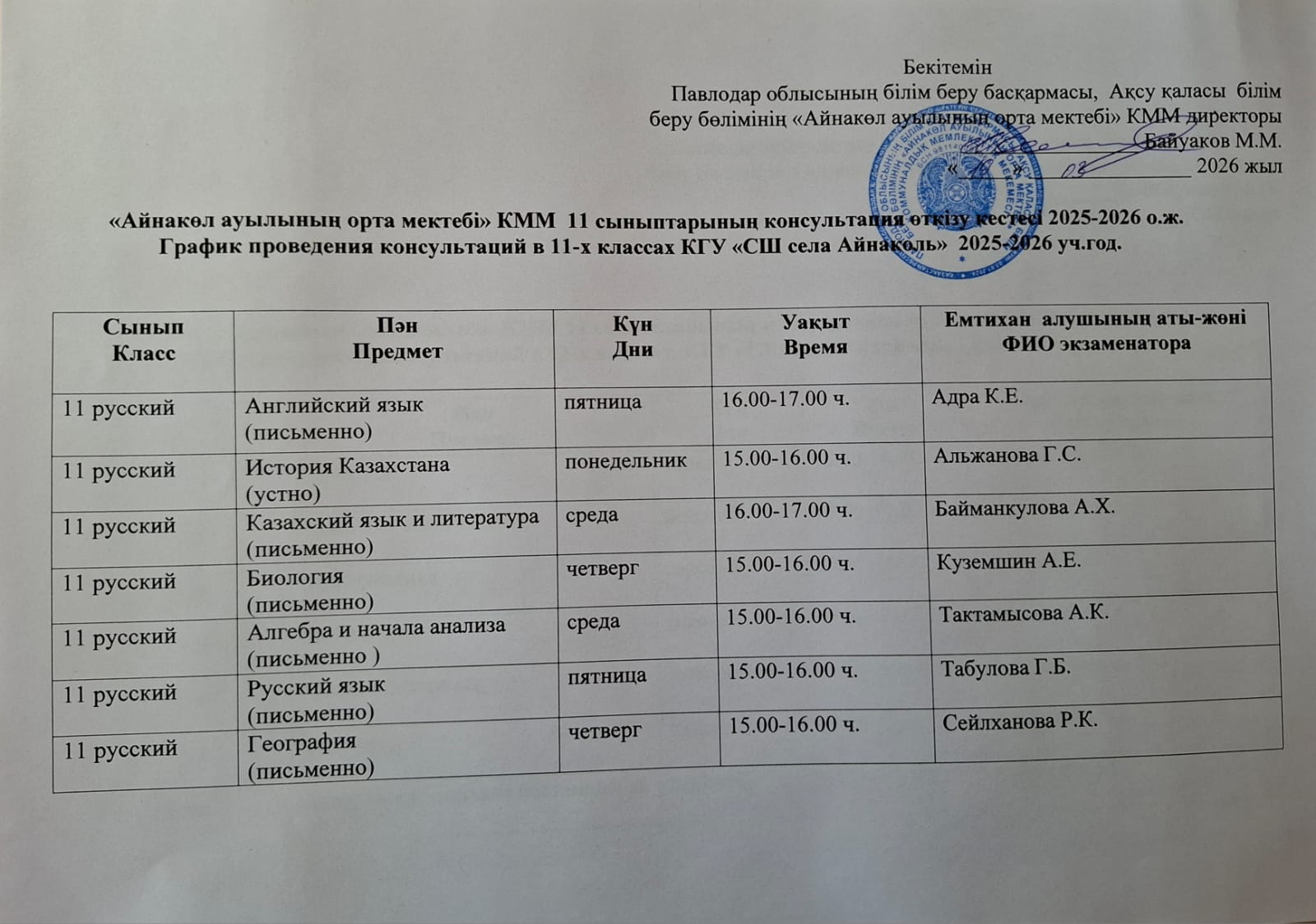 «Айнакөл ауылының орта мектебі» КММ 9, 11 сыныптарының емтихан өткізу кестесі 2025-2026 о.ж.График проведения экзаменов в 9, 11-х классах КГУ «СШ села Айнаколь» 2025-2026 уч.год. Жаңалықтар График консультаций 11 БСкачать График проведения экзаменов 11 АСкачать График консультаций 11 БСкачать График проведения консультаций 11 АСкачать График проведения экзаменов 9 клСкачать График консультаций 9 клСкачать